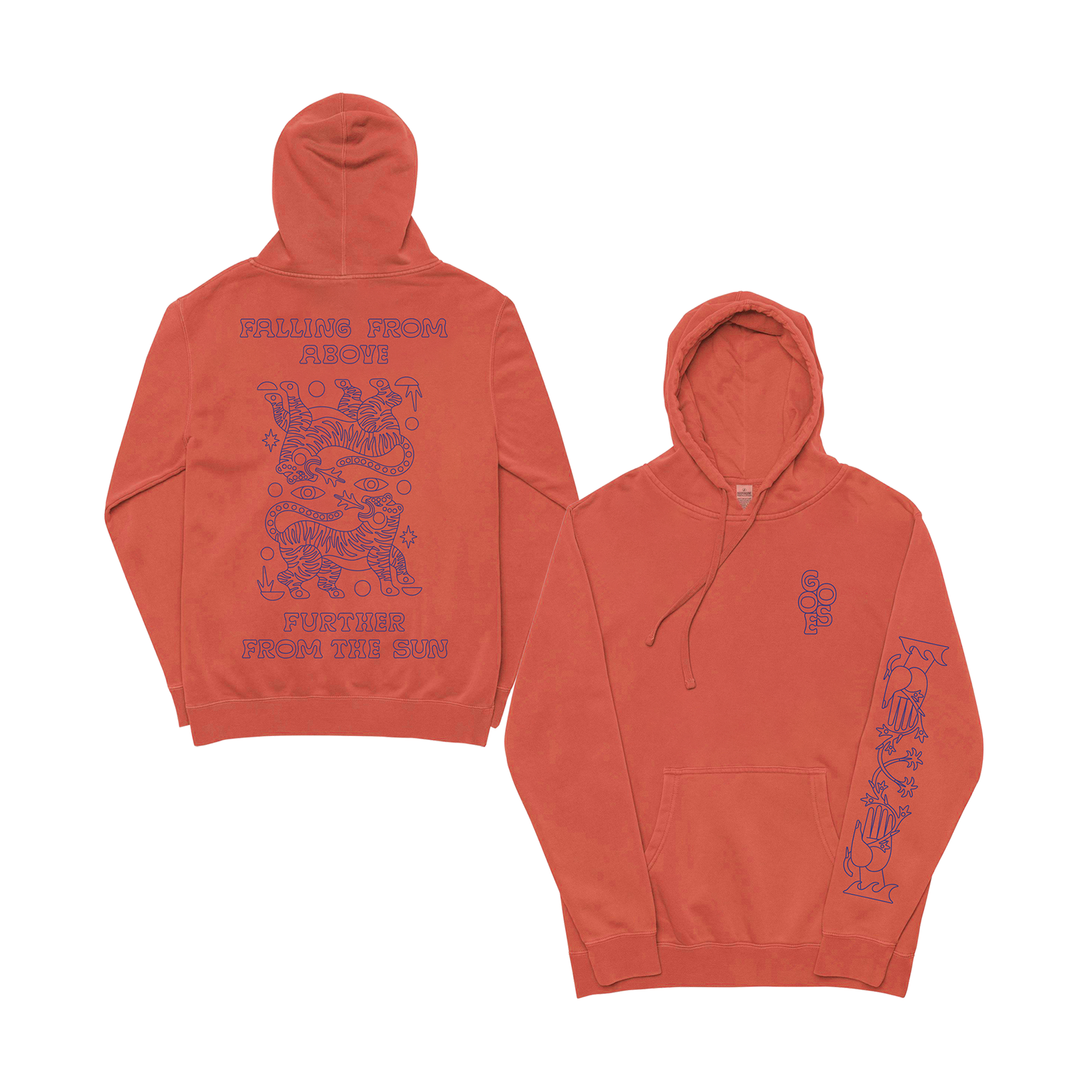 "Goose" design printed on the front left chest with a "From the Sun" design printed on the back of an amber colored pullover hoodie.